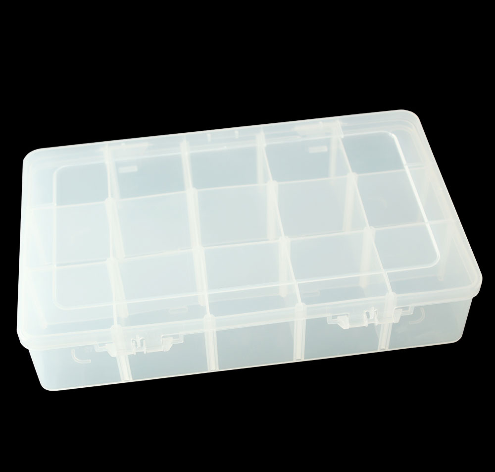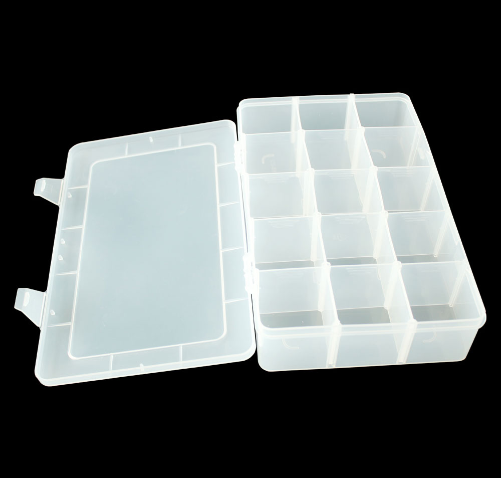 1) 材料:透明PP 2) 柔韧的铰链设计,易于打开与保存 3) 有可移动的间隔,大小组合可以不同 4) 折叠时可以节省空间的设计 5) 广泛用于电子元件,药丸,以及鱼钩 鱼饵的存储等行业